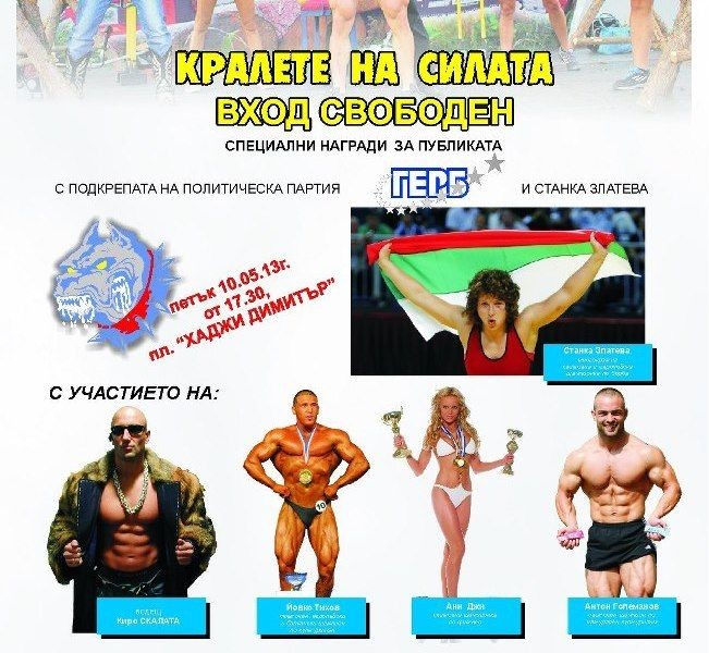 ГЕРБ-Сливен закрива предизборната си кампания с впечатляващо шоу „Кралете на силата”, със специалното участие на Станка Златева, на 10 май от 17,30 часа на площад „Хаджи Димитър”. По традиция в шоуто ще се включат последователи на силовите и бойните спортове, които ще демонстрират своите умения. За първи път – с участието на жени. Водещ и продуцент е Кирил Вълчев – Скалата.