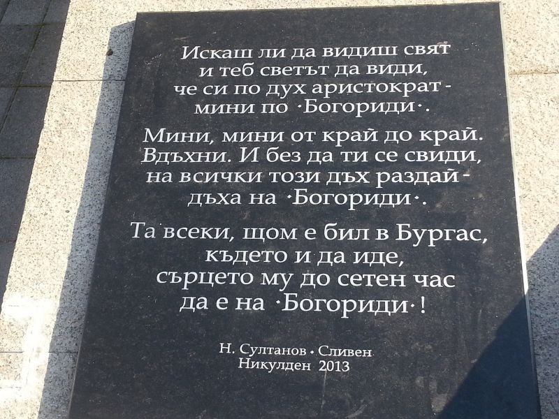 Областната организация на ПП ГЕРБ-Сливен подари на Бургас по повод празника на града - 6 декември, паметна плоча на Алеко Богориди, чието име носи емблематичната улица, която води до морето. На плочата авторът - скулптурът Николай Султанов е написал стих, който впечатли всички бургазлии, които прочетоха редовете на вече монтираната за Никулден плоча.