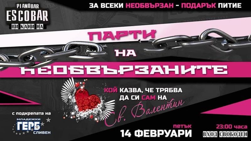 Младежката организация на ПП ГЕРБ-Сливен организира "Парти на необвързаните" на 14 февруари, който по света и от скоро в България се празнува като Деня на влюбените - Свети Валентин. Организаторите насочват вниманието си към всички, които обичат да се веселят, да бъдат с приятна компания, и все още търсят любовта в живота. Подготвени са много изненади и игри, както и подаръци за всички необвързани, които ще се включат в купона. Една интересна вечер в пиано бар "Ескобар" - на 14 февруари от 23 часа!. Входът е свободен.