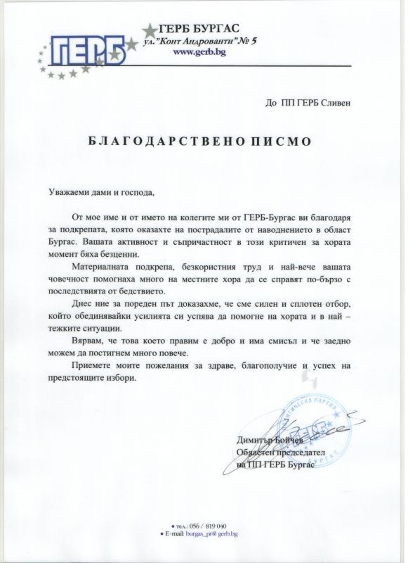 ПП ГЕРБ-Сливен получи благодарствено писмо от областния председател на партията в Бургас Димитър Бойчев. От свое име и от името на колегите си в областната организация той отправя благодарност за оказаната подкрепа на пострадалите от наводнението хора.