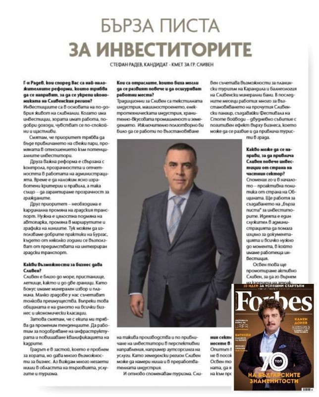 Цялото интервю с кандидата на ГЕРБ за кмет на Сливен може да видите в новия брой на Forbes, който вече е на пазара.