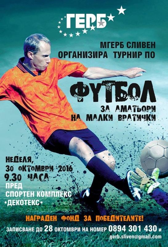 МГЕРБ – Сливен организира турнир по Street ball- Уличен баскетбол, Street fitness и Футбол на малки вратички. Турнирът на по Street ball ще се проведе на 22.10.2016 година (събота) от 10.00 часа в двора на ОУ „Елисавета Багряна“ –Сливен. Записването за участие ще става на място в 09.30 часа в двора на учебното заведение. Вторият турнир, който организира младежката организация ще се проведе в неделя, 23.10.2016 година от 10.00 часа на новоизградената площадка за Street fitness на булевард „Панайот Хитов“ в Сливен. Футболът на малки вратички е с начален час 09.30 часа и ще се състои на 30-ти октомври, неделя в спортен комплекс-ДЕКОТЕКС. Отборите са в състав от 6 души(5+1 вратар). За победители е осигурен награден фонд. Моля изпращайте заявките за участие на е-mail адрес- gerb.sliven@gmail.com. За повече информация- 0894301430.