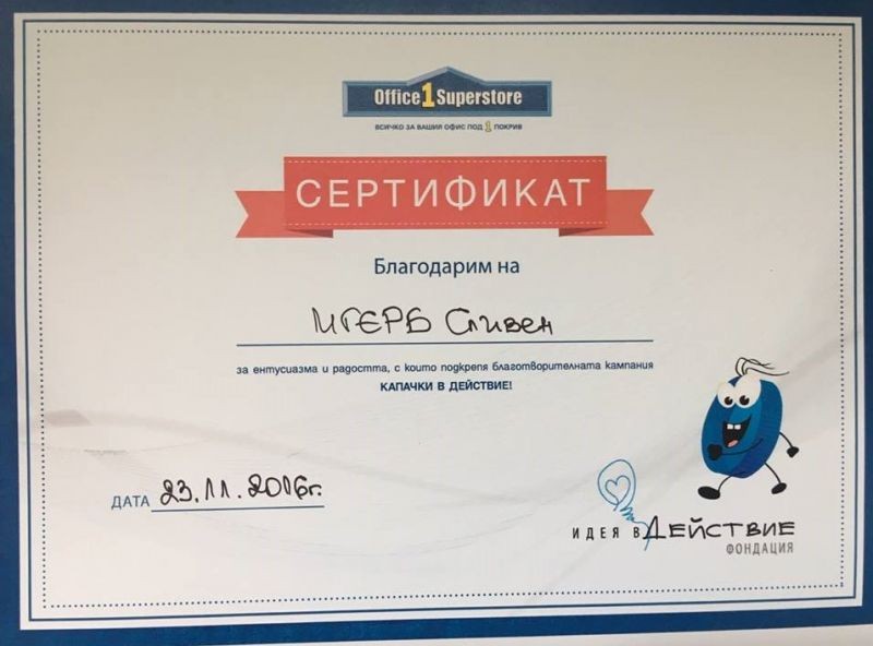 МГЕРБ-Сливен получи сертификат за участие в капанията „Капачки в действие“. Фондация „Идея в действие”, чиято благотворителна инициатива подкрепиха младежите от Сливен, благодари на организацията за ентусиазма и радостта, с които подкрепят кампанията. Младежите се включиха в доброволната инициатива от самото и начало. Те са дарили над 200 кг. капачки. Мисията на кампанията е да помогне за подобряване на условията за отглеждане и живот на деца, лишени от родителска грижа. Освен това чрез разделното събиране на отпадъци се опазва околната среда и природата на България. Със средствата фондацията закупува електроуреди за социални домове и нуждаещи се граждани. Младежите от ПП ГЕРБ-Сливен благодарят на всички, които са дали своят принос в инициативата. Сред тях граждани на Сливен, училища и социални домове.