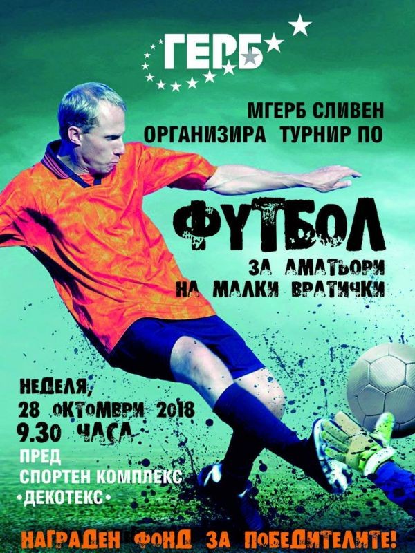 Традиционен турнир по футбол на малки вратички организира Младежката организация на ПП ГЕРБ – Сливен. Състезанието е в рамките на празника на Сливен – Димитровден и ще се проведе за четвърта поредна година. Футболните срещи ще се играят на 28 октомври /неделя/ от 9:30ч. в спортен комплекс „Декотекс”. В надпреварата могат да участват отбори с по шест играчи (5+1 вратар) и двама резерви. Срещите са с продължителност от по 30 минути. По време на турнира, освен най – добрите отбори, ще бъдат връчени и специални награди - за „Най – красив гол“, „Най – техничен играч“ и „Най – добър вратар“.