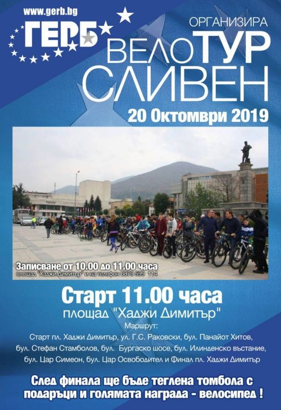 За четвърта поредна година ГЕРБ-Сливен ще обедини любителите на велосипедния спорт. Градският велотур ще се проведе на 20 октомври и е по случай празника на Сливен – Димитровден. За участниците е предвидена томбола с атрактивни подаръци, като голямата награда е велосипед. Победителите ще бъдат наградени от кандидата за кмет Стефан Радев.