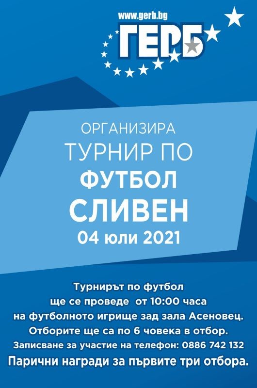 Традиционен турнир по футбол на малки вратички организира Младежката организация на ГЕРБ – Сливен. Състезанието ще се проведе за пета поредна година. Футболните срещи ще се играят на 4 юли /неделя/ от 10 ч. на футболното игрище зад зала „Асеновец“. В надпреварата могат да участват отбори с по шест играчи (5+1 вратар) и двама резерви. Срещите са с продължителност от по 30 минути. По време на турнира, освен награди на най – добрите три отбора, ще бъдат връчени и специални награди – за „Най – красив гол“, „Най – техничен играч“ и „Най – добър вратар“. Ще бъдат осигурени и поощрителни награди.