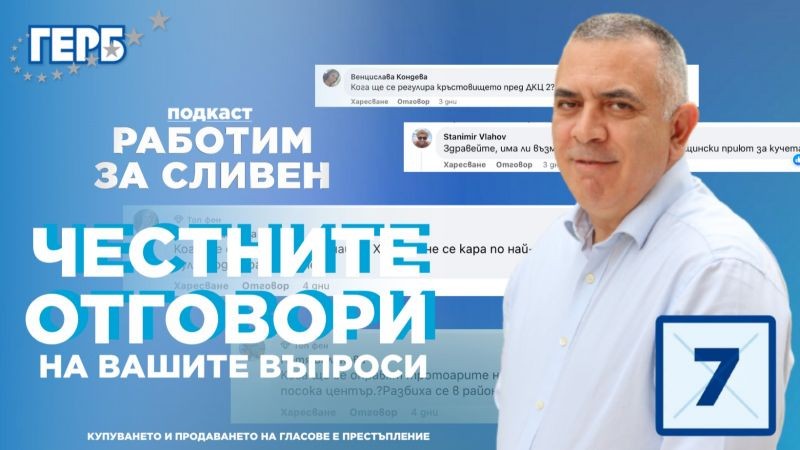 Стефан Радев продължава да очаква въпроси на граждани под поста “ПИТАЙ СТЕФАН РАДЕВ” в официалния му профил. Продължава да бъде отворена и специалната онлайн форма, в която сливналии могат да допълват управленската програма на Радев и ГЕРБ Сливен - https://forms.gle/9ZPsyq9Sya5vnbBD9