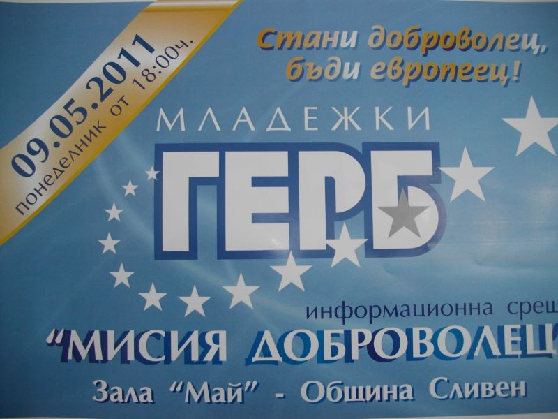 Младежката организация на ГЕРБ-Сливен организира информационна среща „Мисия Доброволец”. Събитието ще се проведе на 9 май – Деня на Европа от 18:00 часа в зала „Май” на Община Сливен. Поводът е, че тази година е обявена за година на доброволчеството. Поканени са експерти от Фондация “Национален алианс за работа с доброволци”/НАРД/. Информационната среща могат да посетят всички, които са съпричастни към доброволчеството. Предвидени са интерактивни игри и разглеждане на казуси.