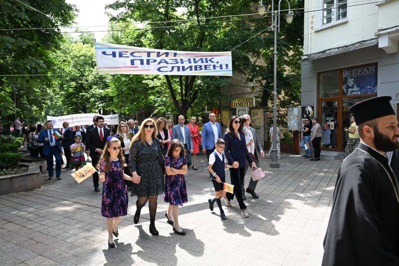 Шествието на сливенските училища тръгна от Градската градина, премина по главната улица на града и приключи пред паметника на Хаджи Димитър и сливенските възрожденци. Стотиците - учители, ученици, културни и просветни дейци, народни представители, областният управител Чавдар Божурски, кметът на Сливен Стефан Радев и неговите заместници, председателят на Общински съвет Димитър Митев, общински съветници, носителите на отличия по повод 24 май, ученици, спечелили национални и международни награди от състезания и олимпиади, бяха предвождани от Военния духов оркестър и мажоретни състави.