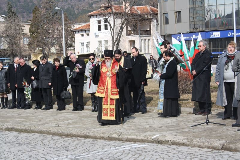 Представители на младежката организация поднесоха венец от името на областното ръководство на партията. Своята почит пред загиналите за свободата на България отдадоха и общинските съветници Здравко Костадинов и д-р Димитър Павлов. Сред официалните лица на церемонията бе и областният управител Марин Кавръков. Благодарствен молебен и панихида в памет на загиналите за Освобождението на България отслужи Негово Високопреосвещенство митрополит Иоаникий в съслужение със сливенски свещеници и дамски хор при катедралния храм „Св. Димитър". След ритуала духовният водач на Сливенска епархия се обърна към гражданите и гостите на града и ги поздрави за празника: