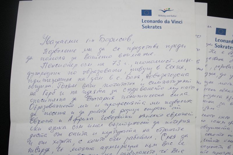 73-годишният Веселин Пионов изпрати писмо на министър-председателя Бойко Борисов, в което отправя покана към премиера да гостува в новозагорското село Баня. Пионов е икономист по образование, живее в Чехия и притежава къща в селото. Работил е в редица страни на Европа и Африка. Той изразява подкрепа за водената от Борисов политика и смята, че ПП ГЕРБ е спасителна за България политическа сила.